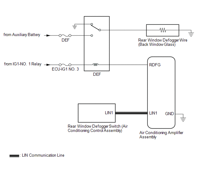 | Rear Window Defogger Switch (Air Conditioning Control Assembly) | Air Conditioning Amplifier Assembly | Rear Window Defogger Switch Signal | LIN |