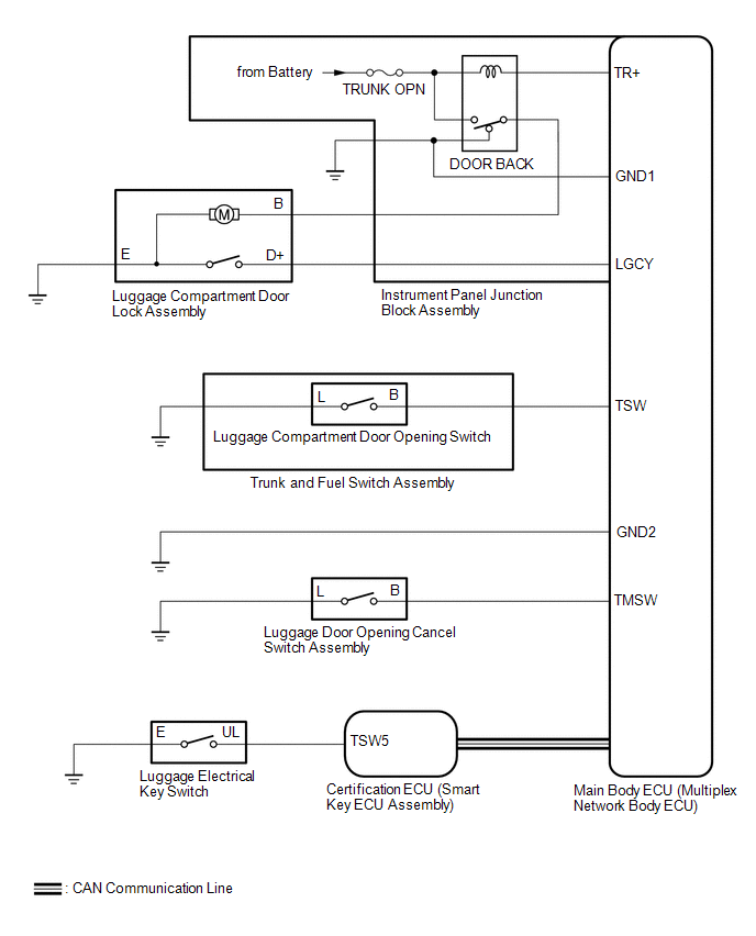 | Certification ECU (Smart Key ECU Assembly) | Main Body ECU (Multiplex Network Body ECU) | Luggage compartment door lock assembly open operation signal | CAN |