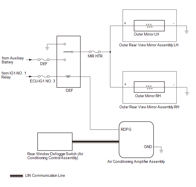 | Air Conditioning Control Assembly | Air Conditioning Amplifier Assembly | Mirror heater switch (rear window defogger switch) signal | LIN |