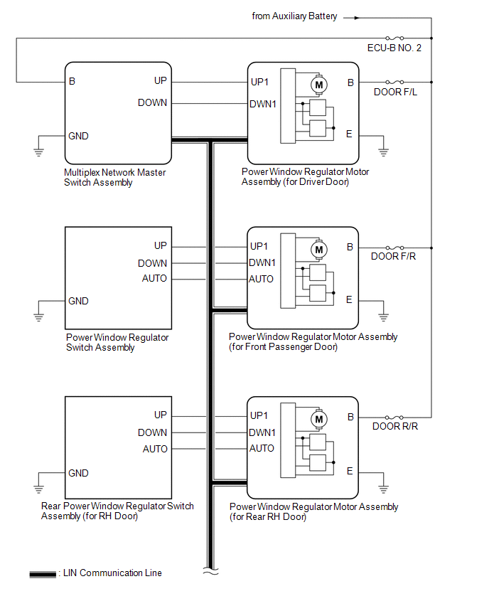 | Multiplex Network Master Switch Assembly | Power Window Regulator Motor Assembly (for Driver Door) | Power window auto up and down signal | LIN |