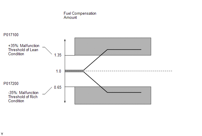 Under closed loop fuel control, fuel injection volumes that deviate from those estimated by the ECM cause changes in the long-term fuel trim compensation value. The long-term fuel trim is adjusted when there are persistent deviations in the short-term fuel trim values. Deviations from the fuel injection volumes estimated by the ECM also affect the average fuel trim learned value, which is a combination of the average short-term fuel trim (fuel feedback compensation value) and the average long-term fuel trim (learned value of the air fuel ratio). If the average fuel trim learned value exceeds the malfunction thresholds, the ECM interprets this as a fault in the fuel system and stores a DTC.