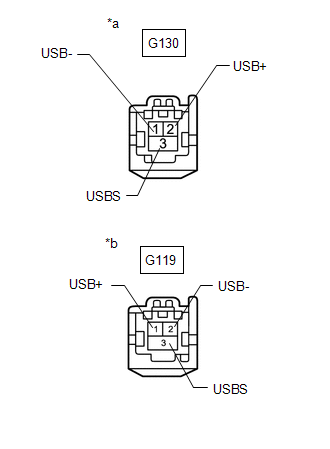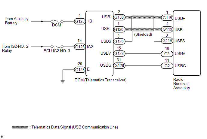 The telematics system uses USB communication between devices. If an open, short, short to +B or short to ground occurs in the USB circuit, communication is interrupted and the telematics system will not operate normally.