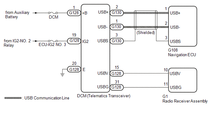 The telematics system uses USB communication between devices. If an open, short, short to +B or short to ground occurs in the USB circuit, communication is interrupted and the telematics system will not operate normally.