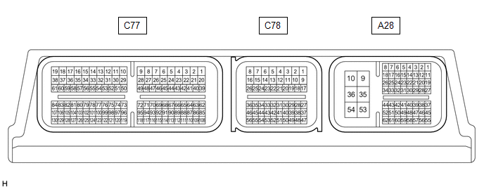| C78-26 (P) - A28-10 (E1) | B - W-B | P shift position switch signal | Engine switch on (IG) and shift lever in P | 11 to 14 V |