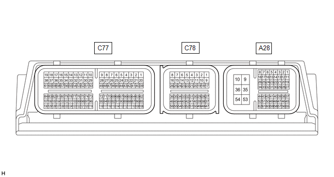 | C77-9 (HA1A) - A28-10 (E1) | L - W-B | Air fuel ratio sensor (sensor 1) heater operation signal | Engine switch on (IG) | 11 to 14 V |