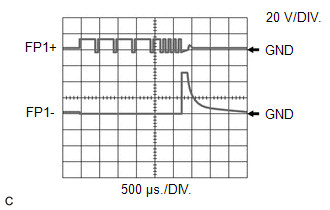 Fuel Pump Assembly (for High Pressure Side) Signal | ECM Terminal Name | CH1: Between FP1+ and E1 CH2: Between FP1- and E1 |