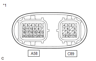 | A58-12 (IGCT) - A58-24 (GND1) | BE - W-B | Input | Motor generator control ECU (MG ECU) power source | Power switch on (IG) | 11 to 14 V |