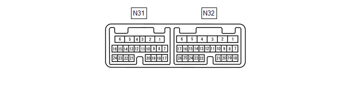 | N32-24 (SGG2) - N32-4 (GND) | LG - LA | Acceleration sensor LH ground | Always | Below 1 Ω |