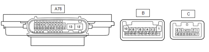| A78-4 (IG) - Body ground | B - Body ground | Ignition power supply | Power switch off | Below 1 V |