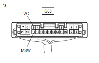 | G63-5 (VC) - G63-18 (MSW) | Engine switch on (IG) | 4.9 to 5.1 V |