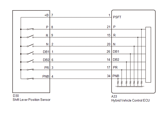 The shift lever position sensor sends 7 different switch signals to the hybrid vehicle control ECU. The hybrid vehicle control ECU uses these signals to detect the shift lever position (P, R, N or D). The hybrid vehicle control ECU also uses this information to determine the intended direction of travel (forward or reverse).
