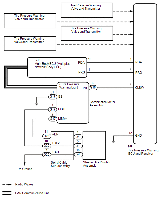 The tire pressure warning valve and transmitters that are installed in the tire and wheel assemblies measure the tire pressure of each wheel. The measured values are transmitted to the tire pressure warning ECU and receiver in the vehicle as radio waves. The ECU compares the measured tire pressure values with the tire pressure threshold. When the measured tire pressure value is less than this threshold, the warning light in the combination meter assembly illuminates. The tire pressure warning ECU and receiver stores a DTC when the tire pressure warning valve and transmitter stops transmitting signals. The signals can be forcibly transmitted by releasing the tire pressure rapidly. The stored DTCs are cleared when signal transmission resumes.
