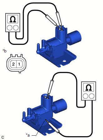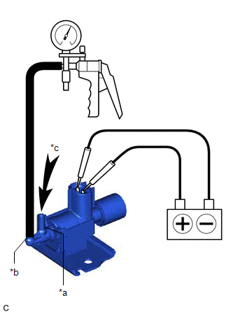 | (2) Apply battery voltage across the terminals. When vacuum is applied to the port (F), check that air is sucked into the port (E). If the result is not as specified, replace the No. 1 vacuum switching valve assembly (for ACIS). |