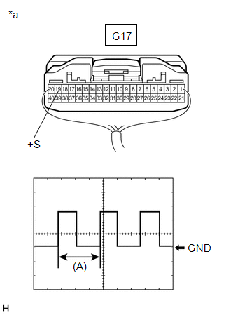 | (a) Check the output waveform. (1) Remove the combination meter assembly with the connector(s) still connected. (2) Connect an oscilloscope to terminal G17-19 (+S) and body ground. (3) Turn the engine switch on (IG). (4) Turn a wheel slowly. (5) Check the signal waveform according to the condition(s) in the table below.