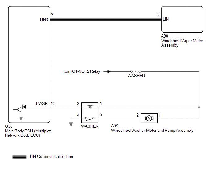 | G36-12 (FWSR) or 2 (WASHER relay) - Body ground | Always | 10 kΩ or higher |