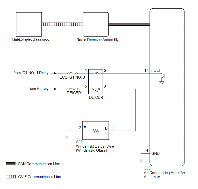 When the front wiper deicer switch is operated, the operation signal is transmitted to the air conditioning amplifier assembly directly. When the air conditioning amplifier assembly receives the signal, it turns on the DEICER relay to operate the windshield deicer system.