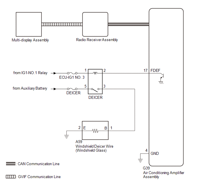 When the front wiper deicer switch is operated, the operation signal is transmitted to the air conditioning amplifier assembly directly. When the air conditioning amplifier assembly receives the signal, it turns on the DEICER relay to operate the windshield deicer system.