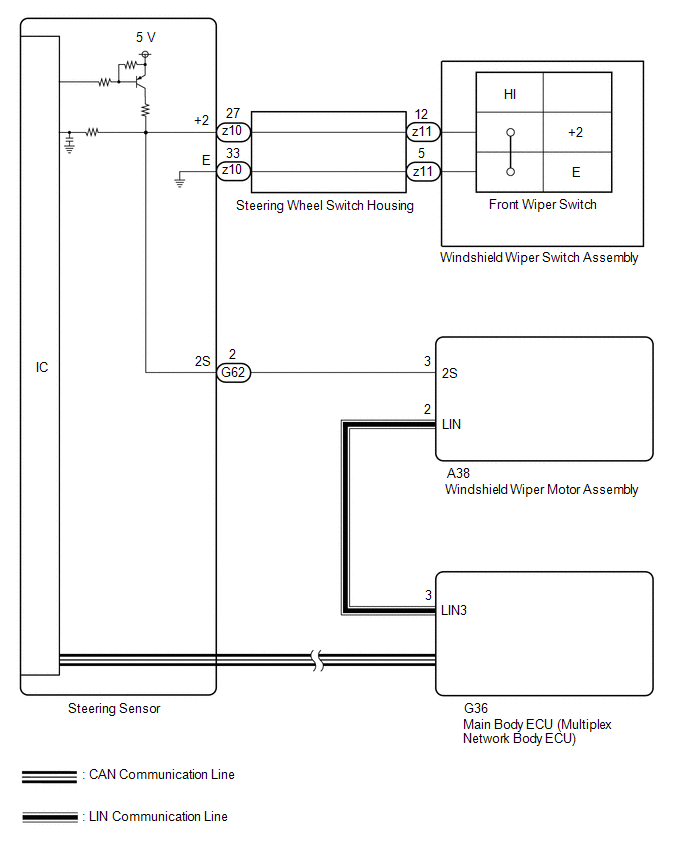 The windshield wiper motor assembly and windshield wiper switch assembly are also connected via direct line in order to operate the front wipers in HI in an emergency. If the operation signals sent via LIN communication and direct line do not match, this DTC is stored.